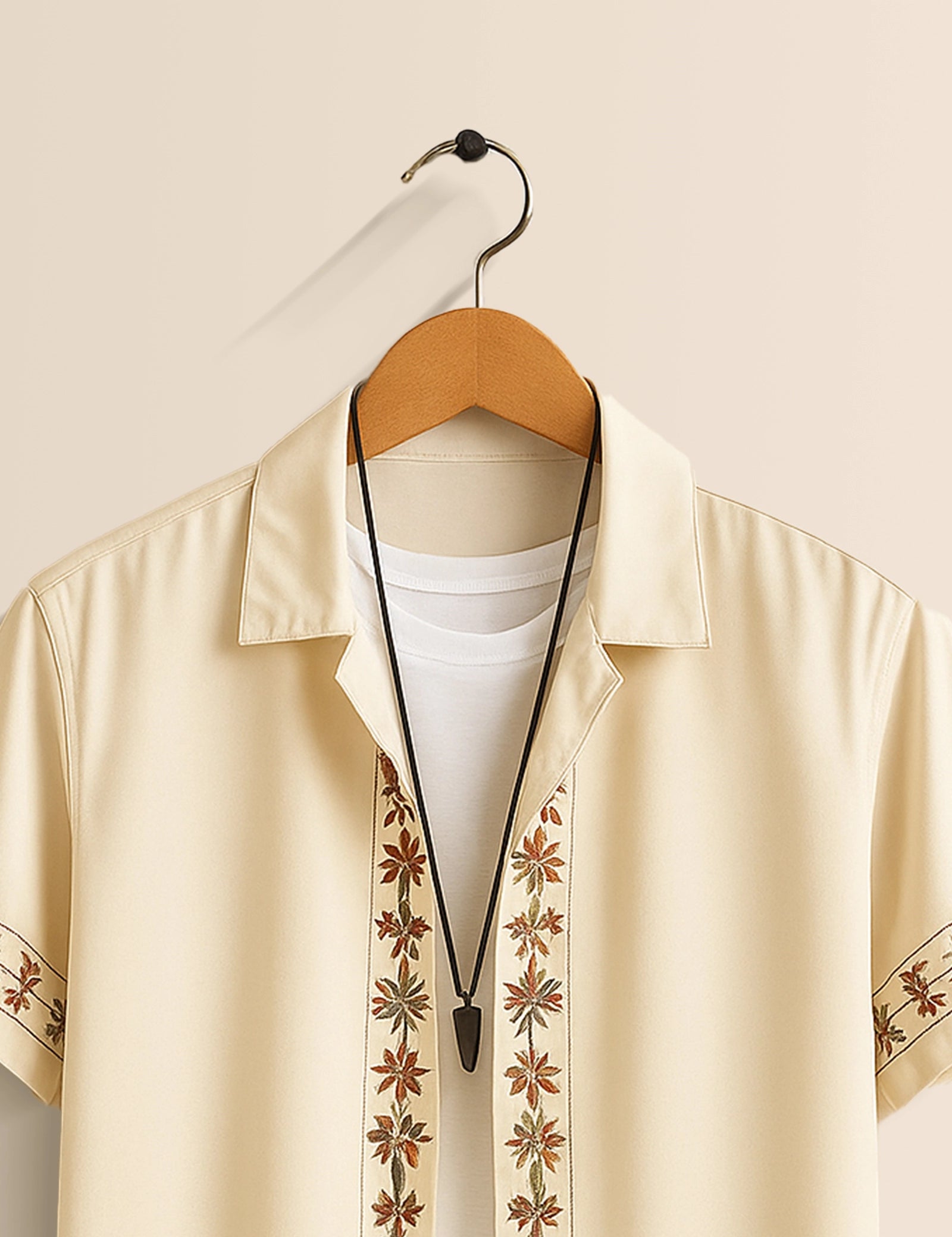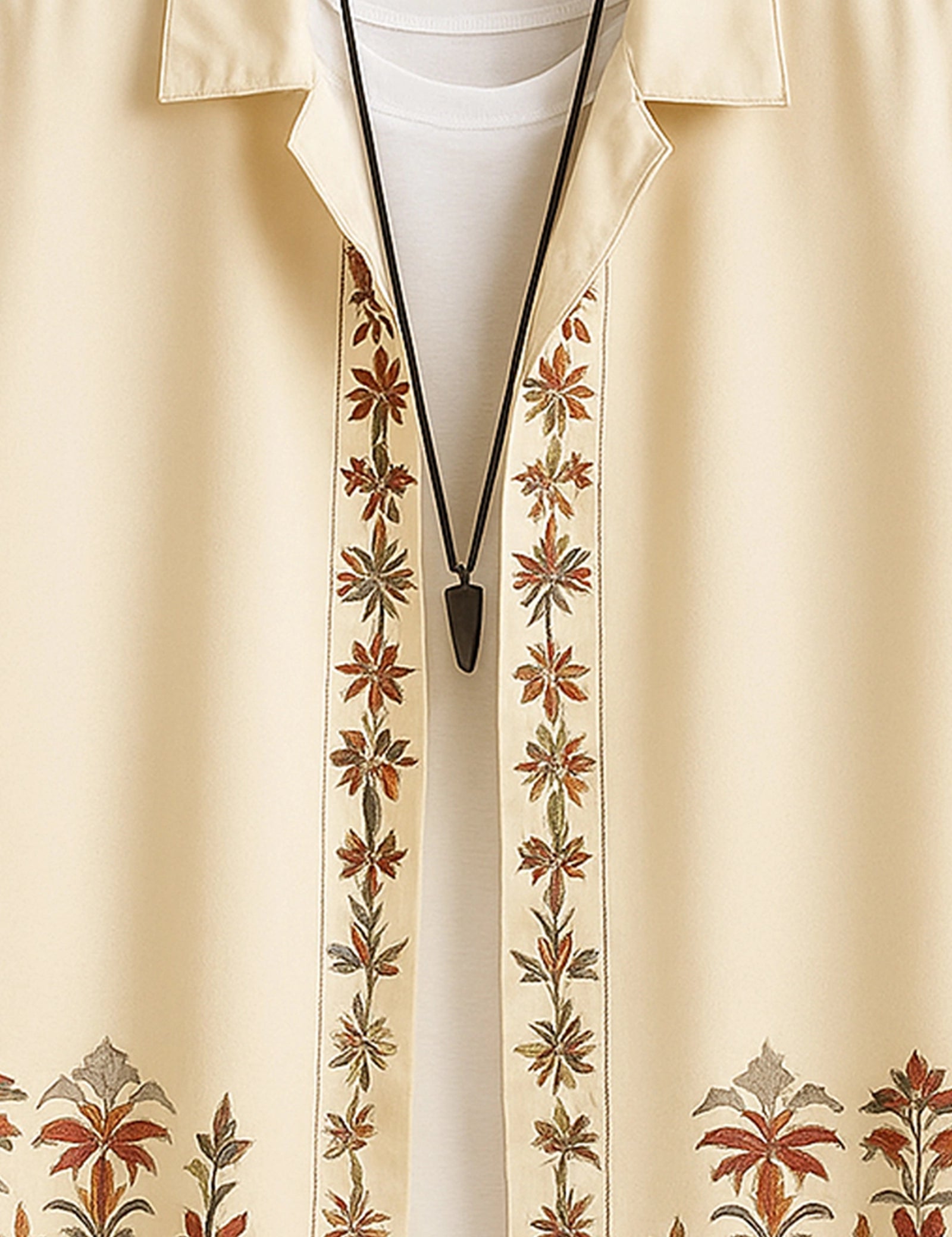 Men's Cream Floral Embroidered - Printed Half Sleeve Shirt - XPST